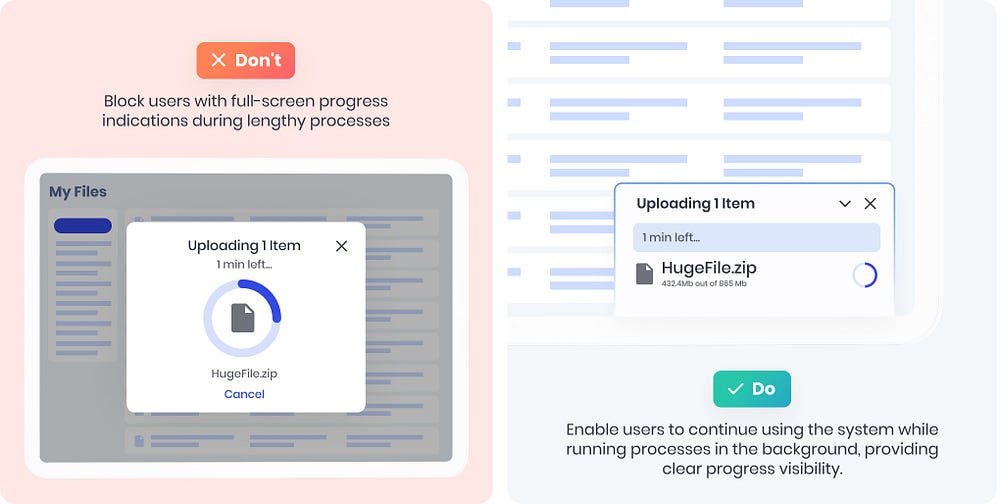 긴 프로세스 중에도 사용자에게 제어권과 유연성을 제공하세요. 전체 화면 진행률 표시로 차단하는 대신 백그라운드에서 프로세스를 실행하면서 진행 상황을 명확하게 파악할 수 있도록 하세요. 사용자가 시스템을 계속 사용할 수 있도록 허용하고 필요한 경우 프로세스를 취소하거나 중단할 수 있는 기능을 제공하세요. 사용자에게 제어 권한을 부여하면 사용자 환경이 개선되고 효율적인 멀티태스킹이 가능해집니다.