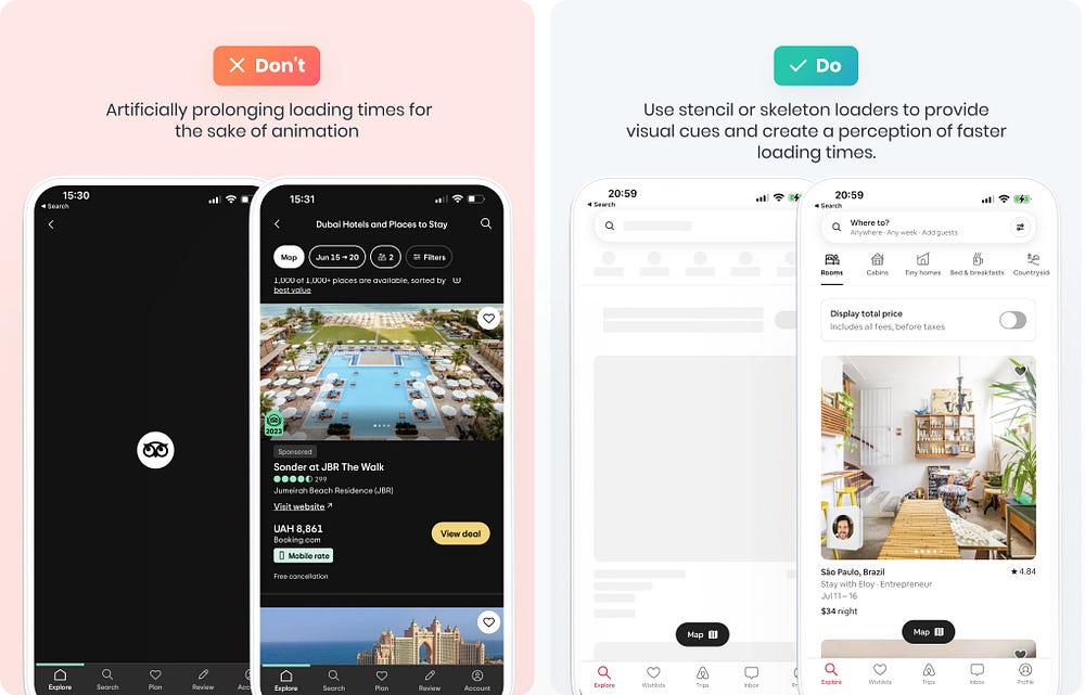 명확한 로딩 피드백 없이 불필요한 애니메이션을 사용하면 사용자의 불만을 초래할 수 있습니다. 디자이너는 사용자 만족도를 유지하고 불필요한 대기 시간을 최소화하기 위해 진행률 표시줄이나 스켈레톤 화면과 같은 의미 있는 로딩 표시기를 우선적으로 제공해야 합니다. 트립어드바이저는 에어비앤비처럼 스텐실 로더를 사용하는 대신 애니메이션 부엉이 아이콘으로 사용자에게 즐거움을 주는 방법을 선택했습니다. 애니메이션은 전반적인 경험을 향상시킬 수 있지만, 사용자가 시간을 낭비하고 있다는 느낌을 받게 해서는 안 됩니다.