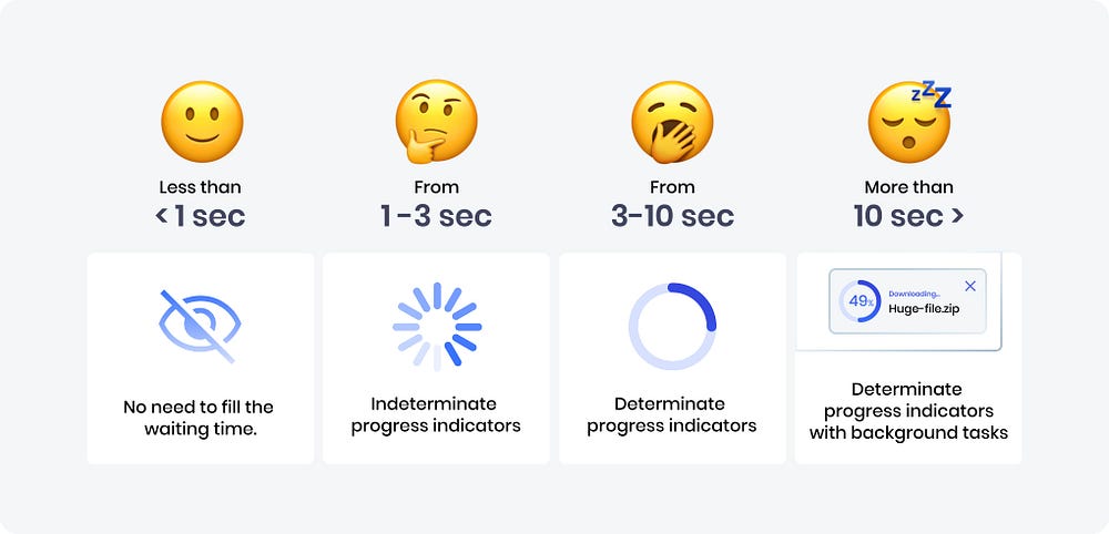 시스템 속도와 응답성을 개선하는 데 가장 중점을 두어야 하지만, 그것이 불가능하다면 적절한 사용자 경험을 디자인하는 것이 중요합니다. 이 글에서는 로딩 및 진행률 표시기의 중요성, 대기 심리에 대해 알아보고 효과적이고 사용자 친화적인 디자인을 만들기 위한 사례를 살펴봅니다.