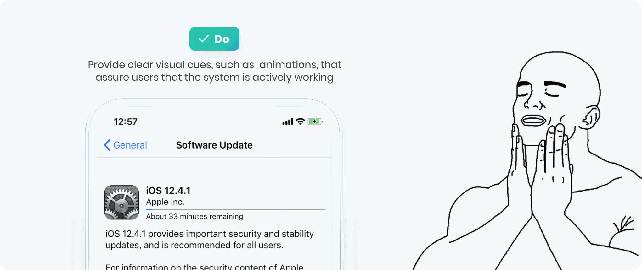 Apple은 시스템 피드백에 관한 한 좋은 사례와 나쁜 사례의 모범이 될 수 있습니다. 예를 들어, iOS 소프트웨어 업데이트 설치 과정에서 톱니바퀴 애니메이션이 계속 회전하면 전체 진행률 표시줄에 진행 상황이 보이지 않더라도 프로세스가 진행 중이라는 사실을 사용자에게 안심시킬 수 있습니다.