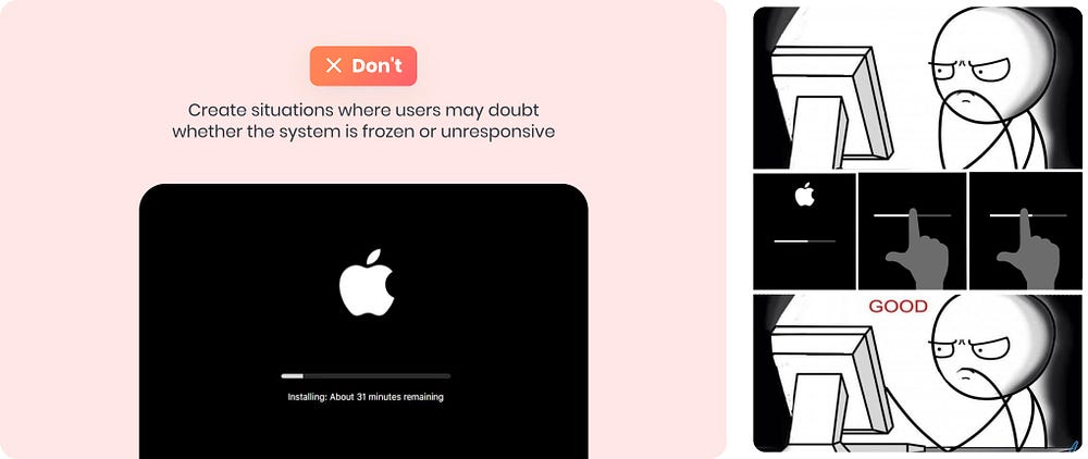 긴 프로세스 중에는 사용자가 시스템이 멈추거나 응답이 없는지 의심할 수 있는 상황을 피하는 것이 중요합니다. 사용자가 불확실한 상태에 놓이게 되면 좌절감과 신뢰 상실로 이어질 수 있습니다.