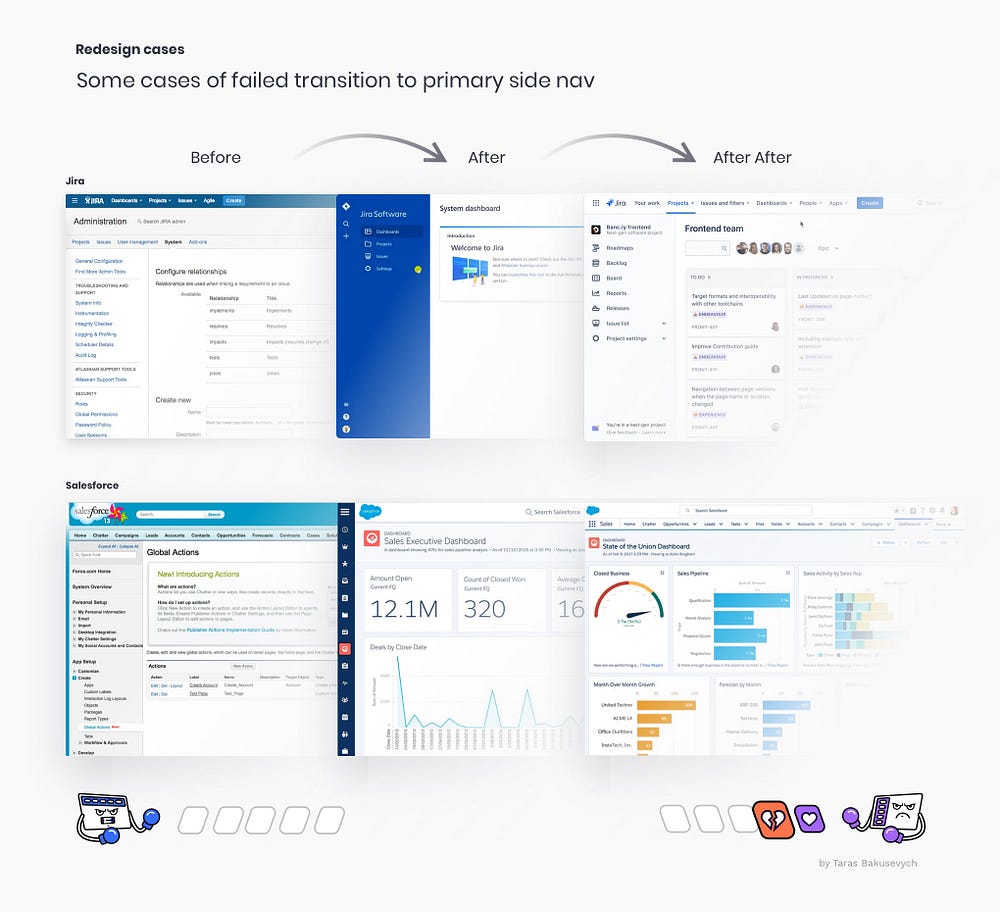 내비게이션 재설계는 항상 어려운 과제입니다. 사용자는 특히 매일 제품을 사용할 때 내비게이션에 익숙해집니다. 이 탐색을 조금만 변경해도 사용자에게 혼란을 줄 수 있습니다. 새로운 학습 곡선에도 불구하고, Jira Cloud 탐색을 사이드 메뉴로 전환하는 것과 같은 일부 사례는 사용자들의 큰 반발에 직면했습니다. Jira가 피드백을 제공하기 위해 사용자를 모집했을 때 초기 사용자의 95% 이상(350명 중)이 사이드 메뉴보다 새로운 '이전' 상단 탐색을 선호했습니다.