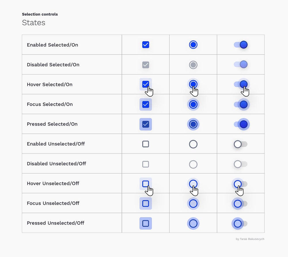 체크박스 및 라디오 버튼은 선택하거나 선택 해제할 수 있으며, 토글은 끄거나 켤 수 있습니다. 모두 활성화, 비활성화, 호버링, 포커스, 눌림 상태가 있습니다. 많은 것처럼 보이지만 안정적인 상호 작용을 위해 이러한 모든 상태를 만드는 것이 좋습니다.