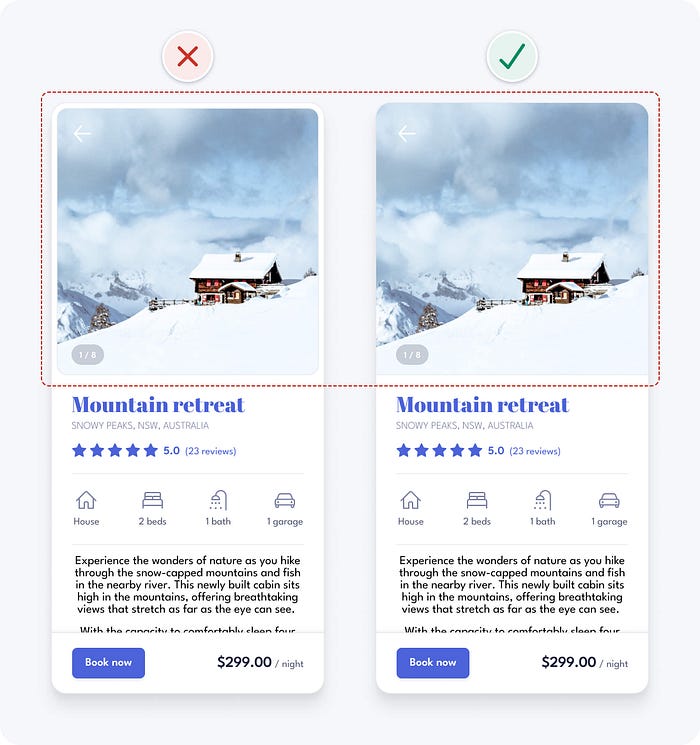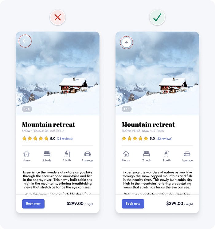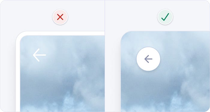 이 예에서는 사진 위에 있는 화살표 아이콘의 대비가 너무 낮습니다. 아이콘에 회색을 사용하고 흰색 단색 배경을 추가하면 사진에 상관없이 3:1의 충분한 대비를 얻을 수 있습니다. 또한 아이콘의 탭 영역이 더 커지고 명확하게 표시되므로 상호 작용 비용도 줄어듭니다.