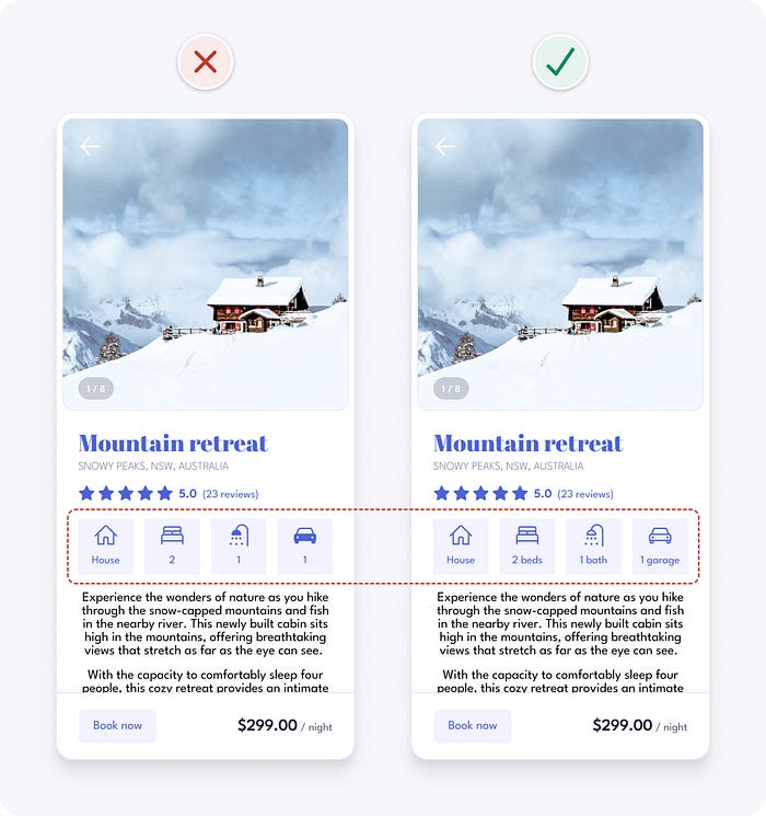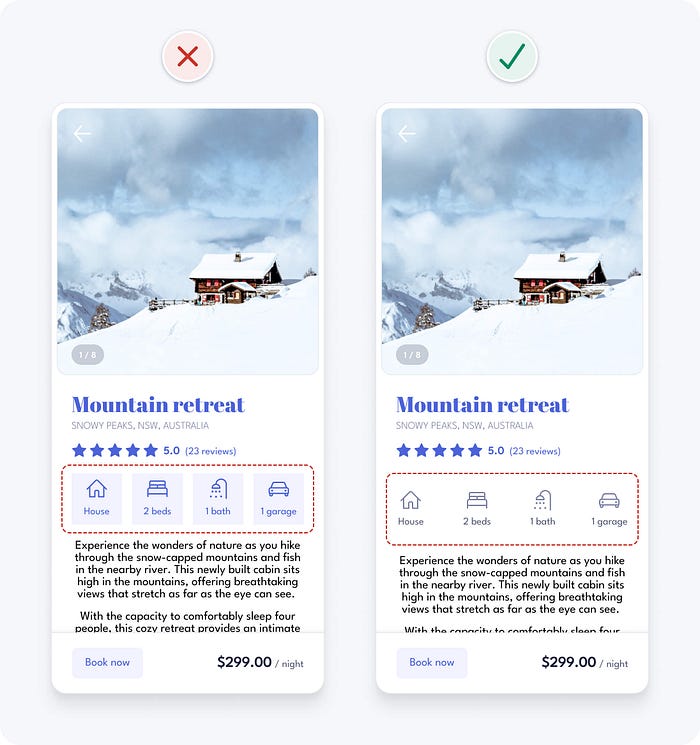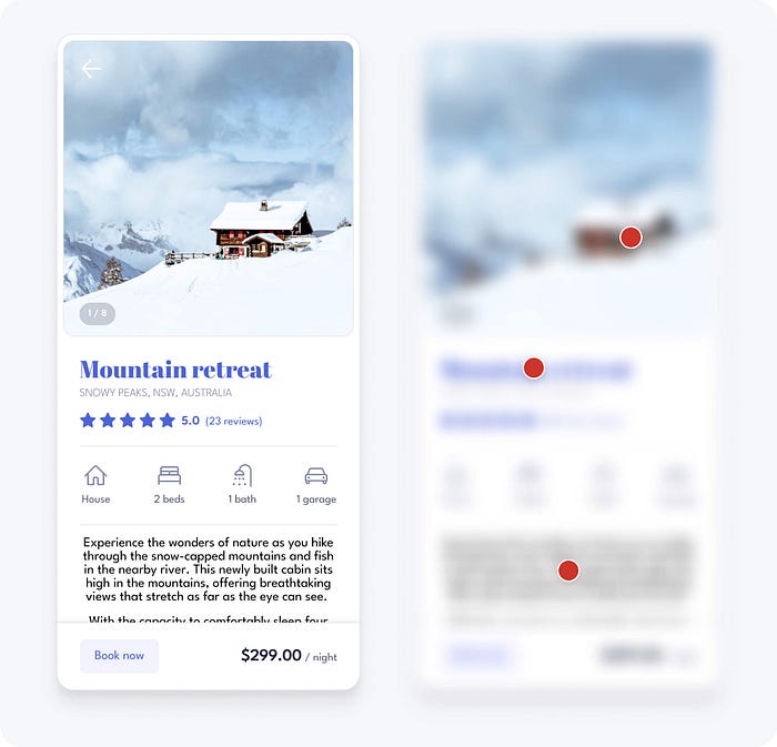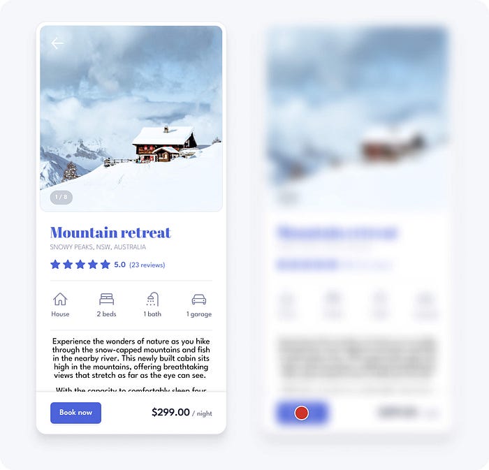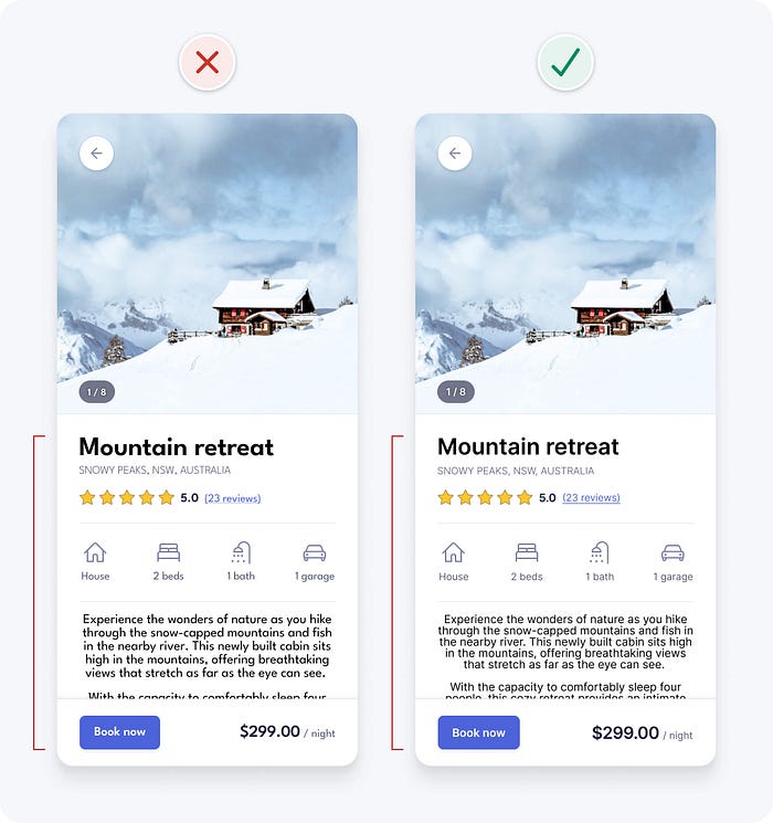 다음 두 가지 디자인은 단기 숙소 임대 앱의 숙소 세부 정보 페이지용 디자인입니다. 첫 번째는 원래 디자인입니다. 두 번째는 몇 가지 논리적 가이드라인을 적용한 결과입니다.