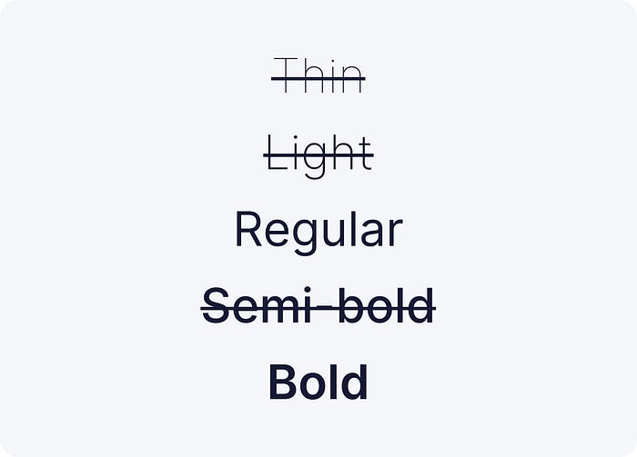 서체에서 사용할 수 있는 글꼴 가중치가 많다고 해서 UI 디자인에 모두 사용해야 하는 것은 아닙니다. 다양한 글꼴 가중치를 많이 사용하면 인터페이스에 노이즈와 복잡함이 더해질 수 있습니다. 또한 각 글꼴 가중치를 일관되게 사용하기가 더 어려워집니다.