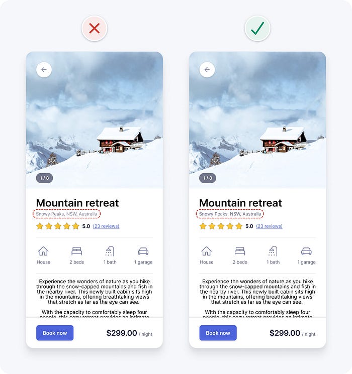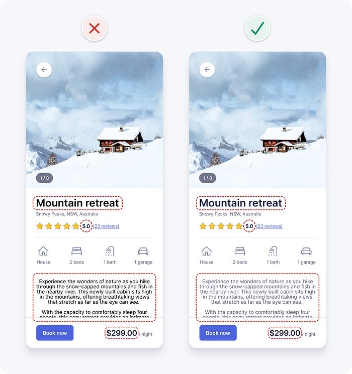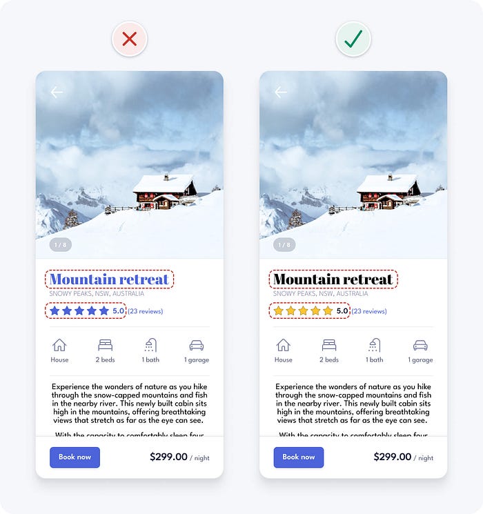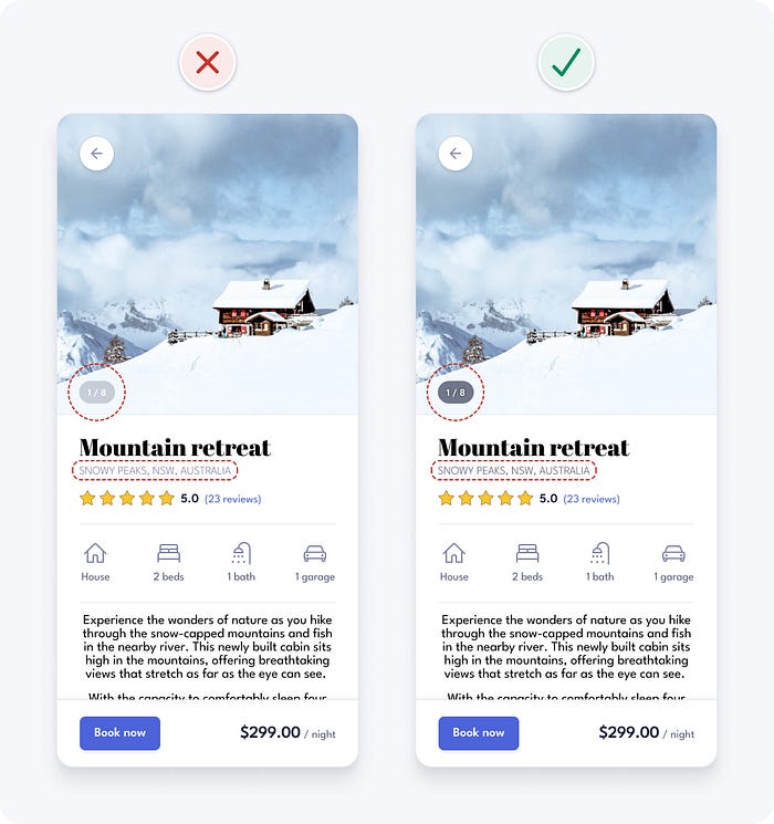 이 예제에서는 제목에 세세한 세리프 서체를 사용했는데, 다소 읽기 어렵고 산만할 수 있습니다. 또한 이 숙소 렌탈 앱의 일부 사진과 어울리지 않을 수 있는 개성을 가지고 있습니다. 본문 텍스트에 사용되는 것과 같은 산세 리프 서체로 단순화하면 사용성과 심미성을 개선하는 데 도움이 될 수 있습니다.