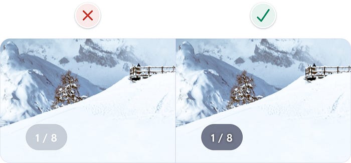이 예에서는 사진 수 요소의 작은 텍스트의 대비가 충분하지 않습니다. 회색 컨테이너의 불투명도를 높이고 텍스트 그림자를 추가하여 대비 비율을 4.5:1 이상으로 높였습니다.