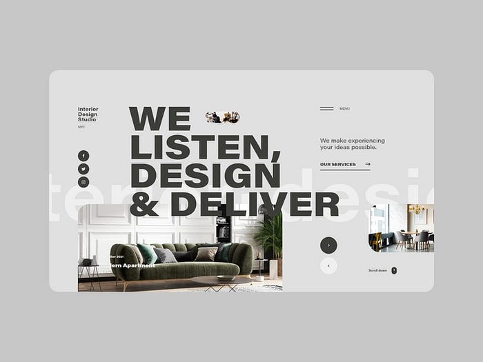 사이즈의 좋은 예는 위의 인테리어 디자인 이미지에서 찾을 수 있습니다. 가장 먼저 눈에 띄는 것은 회사가 하는 일을 설명하는 텍스트입니다.