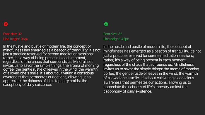 줄 높이가 적절하면 텍스트가 읽기 쉽고 빽빽하게 느껴지거나 지나치게 간격이 좁아지지 않습니다.