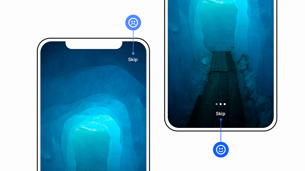 모바일 앱의 초기 안내 과정은 사용자가 언제든지 건너뛸 수 있도록 설정하고, ‘건너뛰기’ 링크는 엄지손가락이 닿기 쉬운 위치에 배치하세요.