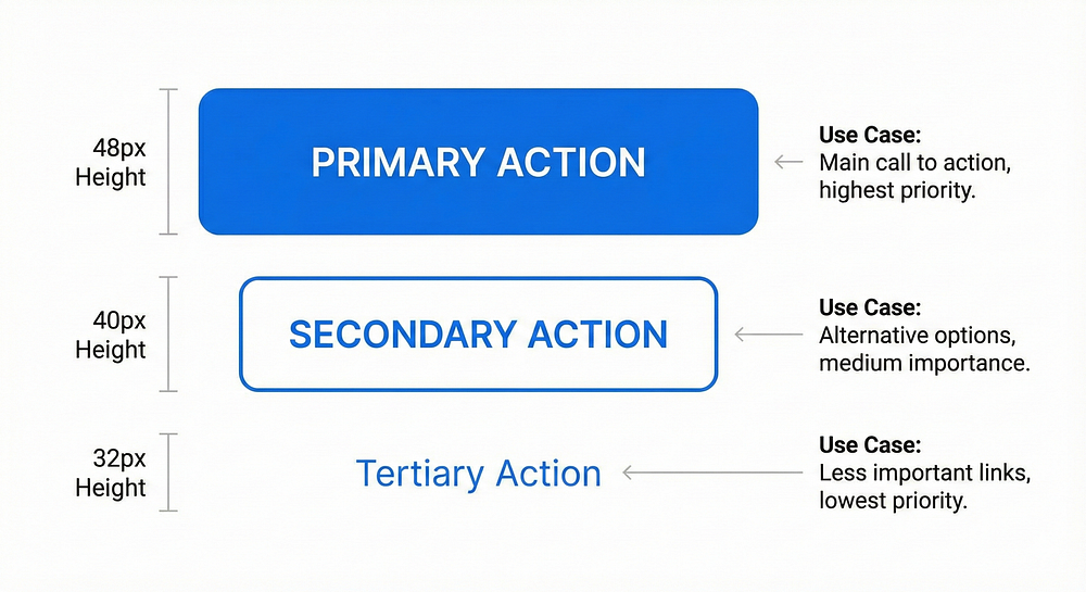 예를 들어, 회원가입 페이지에서 '계정 생성하기'는 배경색이 채워진 대형 주요 버튼으로 배치하고, '기존 계정으로 로그인'은 중간 크기의 테두리 버튼으로, '상세 정보 보기'는 작은 텍스트 링크 형태로 구성하는 것이 좋습니다.