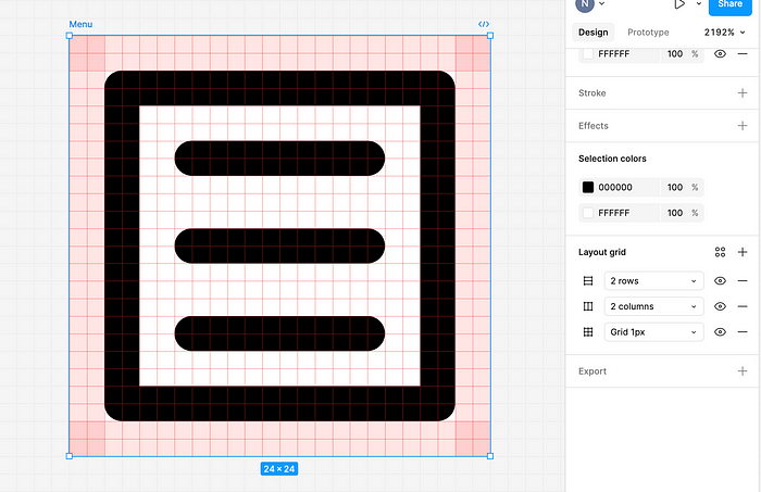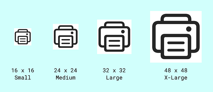 - 24 x 24 픽셀. 대부분의 최신 웹 및 모바일 앱의 표준 크기로, 디테일을 살릴 수 있을 만큼 충분히 크면서도 UI 요소 안에 편안하게 들어갈 수 있을 만큼 작습니다.