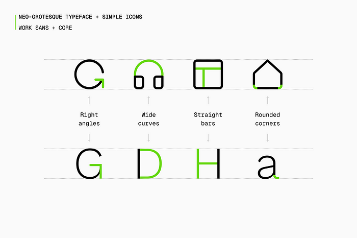 헬베티카나 로보토처럼 기하학적인 서체라면 아이콘은 기하학적인 모양과 날카로운 모서리를 가져야 합니다. 서체가 더 유기적이고 인본주의적인 느낌이라면(Avenir 또는 Gotham 등) 아이콘은 더 부드러운 곡선과 부드러운 미학을 가져야 합니다.