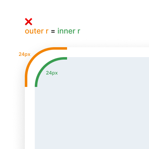 요소를 중첩할 때 부모 요소와 자식 요소 모두에 동일한 모서리 반경을 사용하는 경우가 많습니다. 하지만 반경이 같으면 부모 요소와 자식 요소 사이의 간격(패딩)의 두께가 일정하지 않아(어떤 부분은 더 두껍고 어떤 부분은 더 얇아짐) 시각적인 관점에서 보기 좋지 않은 UI 디자인이 될 수 있습니다.