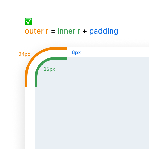 한 가지 방법은 부모 요소보다 자식 요소에 약간 더 작은 모서리 반경을 사용하는 것입니다. 이렇게 하면 가장자리 주변에 보다 일관된 시각적 간격을 만드는 데 도움이 됩니다. 동일한 곡률을 유지하려면 간단한 공식을 사용합니다: