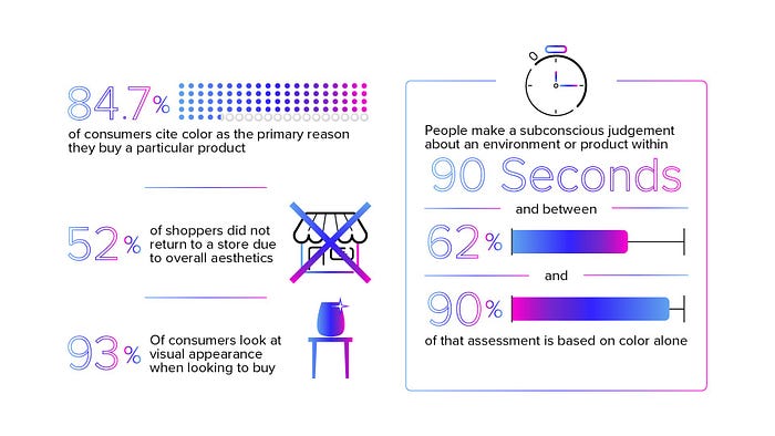 사용자는 90초 이내에 제품에 대한 무의식적인 판단을 내리는데, 이러한 판단의 최대 90%가 색상만을 기준으로 이루어집니다.