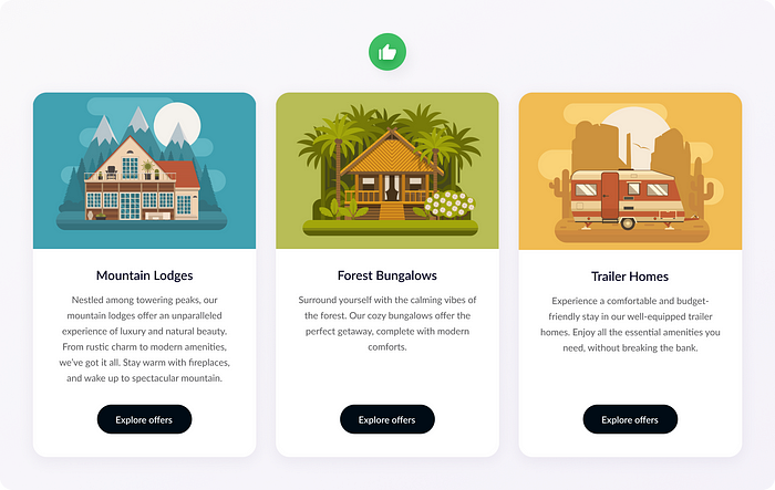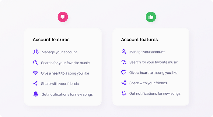 또한 제목과 설명의 길이도 같은 길이로 만드세요. 이렇게 하면 모든 카드의 높이를 동일하게 유지하여 디자인이 더욱 균형 있게 보입니다. UX 카피에 영향을 줄 수 있다면 모든 카드의 줄 수를 동일하게 유지하세요.