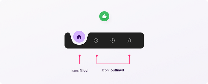 그렇다고 해서 규칙이 정해진 것은 아닙니다. 서로 다른 상태를 표시하는 등 다양한 아이콘 스타일을 혼합하는 것이 유리한 경우도 있습니다. 예를 들어 하단 탐색에서 선택한 탭에는 채워진 아이콘을 사용하고 다른 탭에는 윤곽선이 있는 아이콘을 사용할 수 있습니다. 이러한 미묘한 스타일의 변화는 사용자가 앱 내에서 자신의 현재 위치를 빠르게 파악할 수 있도록 도와주는 기능적인 목적에 부합합니다.