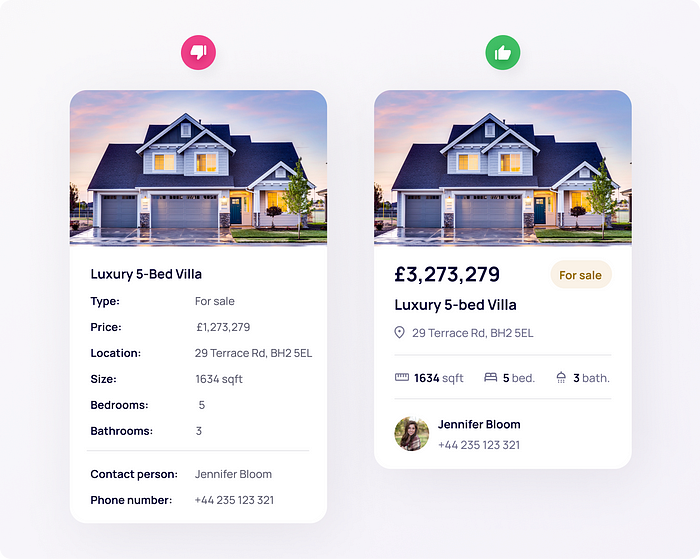왼쪽의 디자인은 레이블:값 필드에 의존하고 있습니다. 이 방식이 효율적일 수 있지만 페이지의 모든 정보를 동일한 방식으로 표시하면 시각적 계층 구조가 부족해집니다. 따라서 사용자가 페이지를 스캔하여 중요한 정보를 식별하기가 어렵습니다.